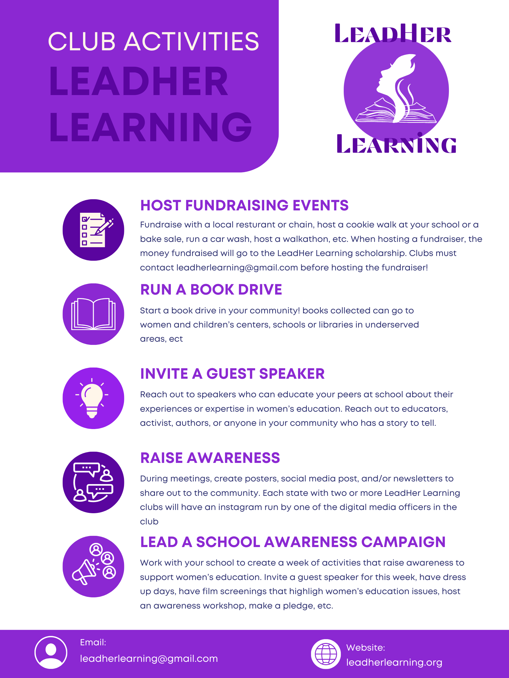 These are some activities we encourage your school's LeadHer Learning to take part in. Your school's club is not limited to these activities, but they are highly representative of what LeadHer Learning is all about. Anytime your club runs an event, post it on your school's personal LeadHer Learning Instagram and mention your state's Instagram account and the national Instagram account to be reposted on those accounts! Always feel free to contact us by emailing leadherlearning@gmail.com for help, any questions, and to market your events! When fundraising, reach out to us via email, and we will help your club determine how to handle finances, secure funding for the scholarship, and market your event! Can't wait to see what your LeadHer Learning chapter accomplishes!